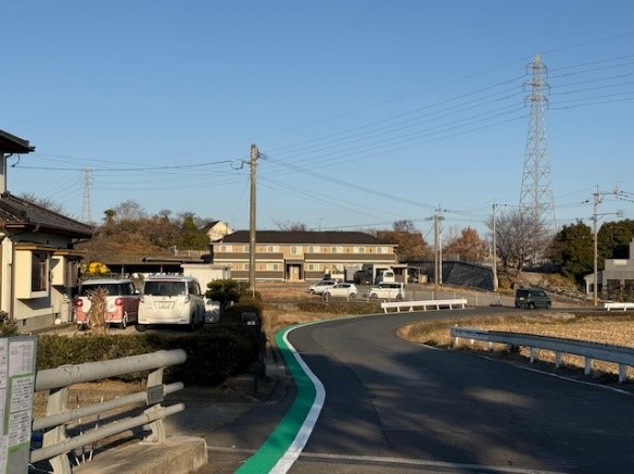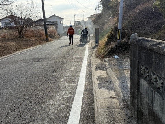 道新 第17号 通学路整備工事。区画線を引き(白線)滑り止めの薄層カラー舗装(グリーンベルト)化 歩道のない道路における歩行者の安全確保、通学路での事故防止に有効な工事をしています。もうすぐ竣工です。 FacebookXBlueskyCopy